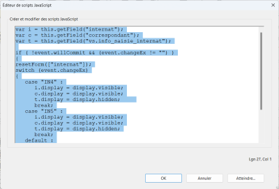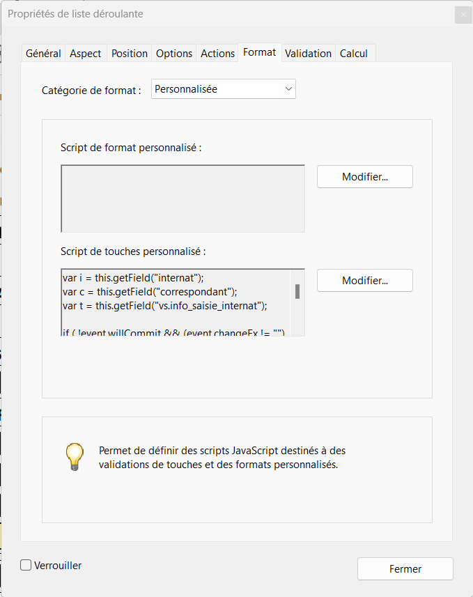 Insertion de code dans la propriété format d'une liste déroulante. En cliquant sur le bouton Modifier, la fenêtre d'édition du code Javascript s'affiche.